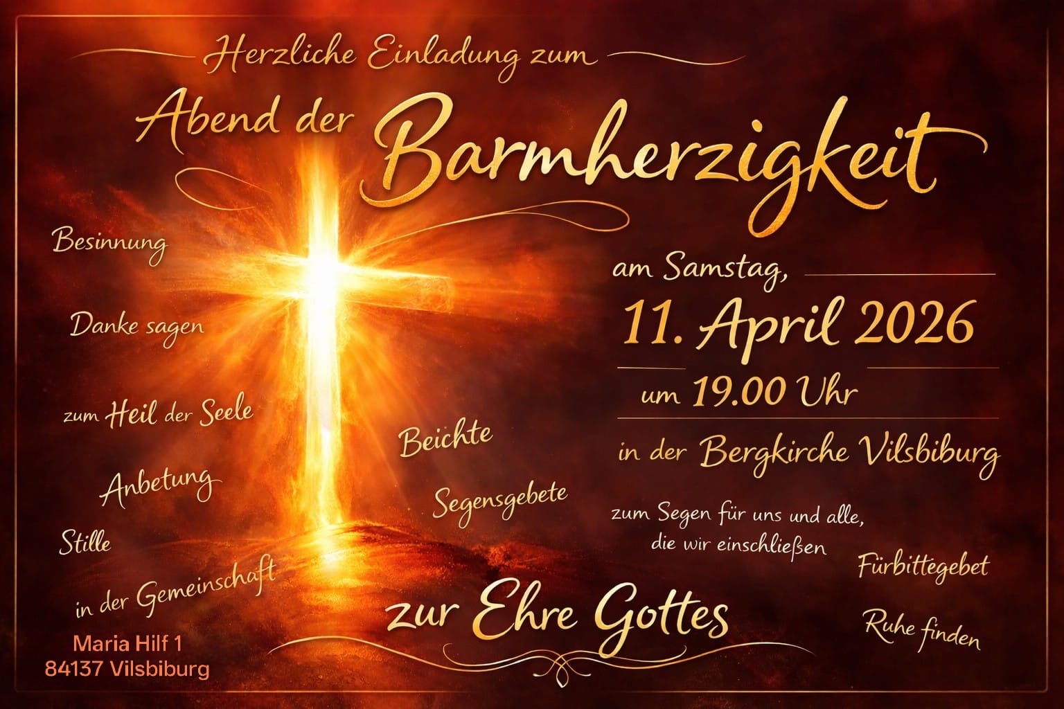 Herzlich Willkommen zum Abend der Barmherzigkeit am Samstag, den 11. April 2026 ab 19:00 Uhr in der Wallfahrtskirche, Maria Hilf, Vilsbiburg.
